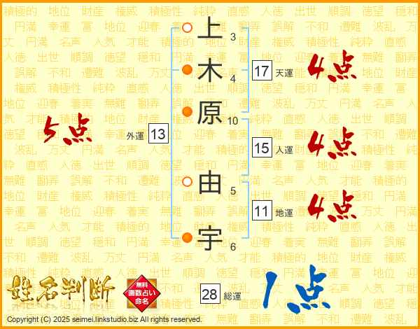 上(3画)木(4画)原(10画) 由(5画)宇(6画)