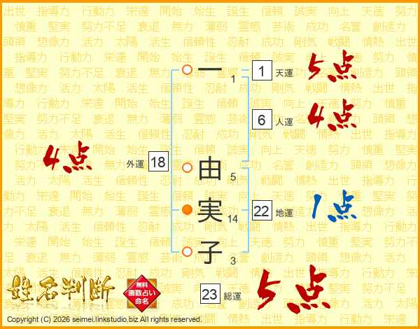 生活面を象徴する運勢です。外部から受ける影響力を表し、結婚運、家庭運や職場、環境への順応性を表します。総運から人運を引いた画数。姓や名が1文字の場合を除く。