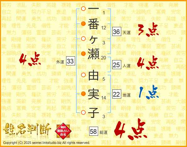一番ヶ瀬由実子さんの総運は58画の4点!