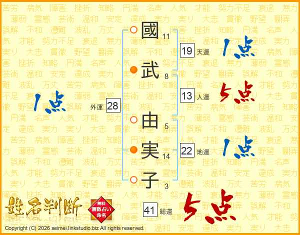 國(11画)武(8画) 由(5画)実(14画)子(3画)