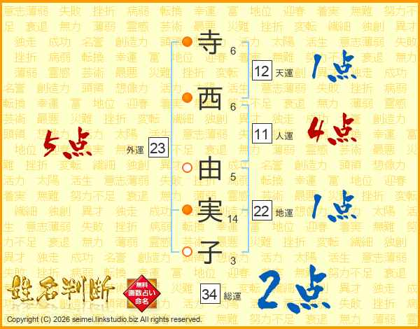 寺(6画)西(6画) 由(5画)実(14画)子(3画)