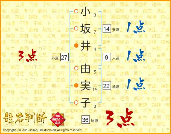 小(3画)坂(7画)井(4画) 由(5画)実(14画)子(3画)