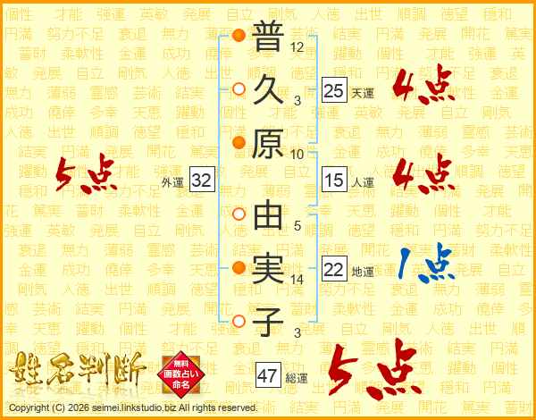 普(12画)久(3画)原(10画) 由(5画)実(14画)子(3画)