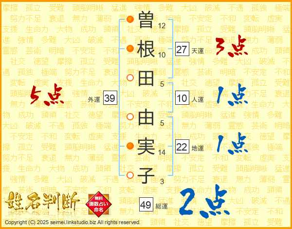 曽(12画)根(10画)田(5画) 由(5画)実(14画)子(3画)