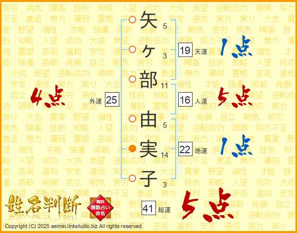 矢ヶ部由実子さんの総運は41画の5点!