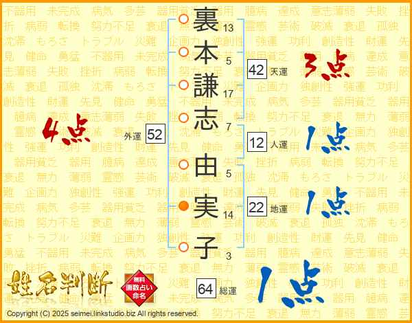 裏(13画)本(5画)謙(17画)志(7画) 由(5画)実(14画)子(3画)