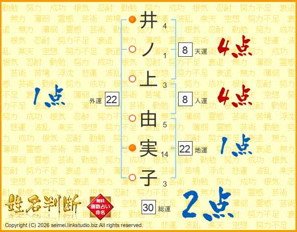 井(4画)ノ(1画)上(3画) 由(5画)実(14画)子(3画)