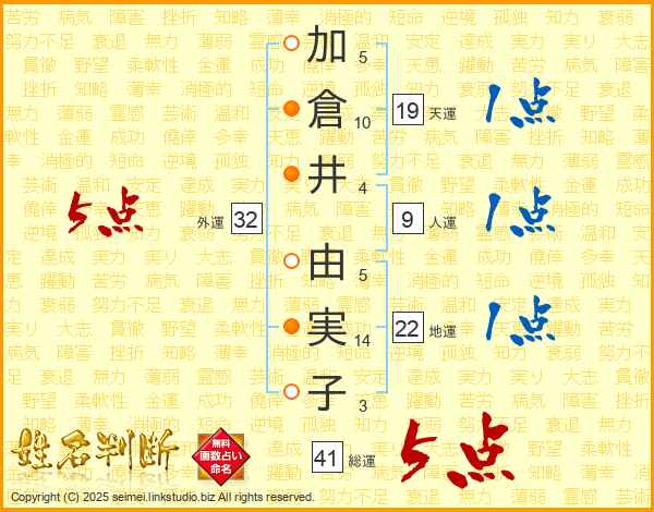 加(5画)倉(10画)井(4画) 由(5画)実(14画)子(3画)