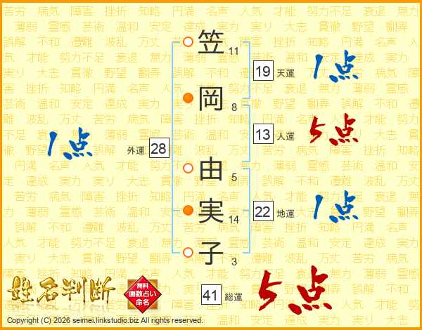笠(11画)岡(8画) 由(5画)実(14画)子(3画)