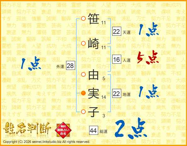 笹(11画)崎(11画) 由(5画)実(14画)子(3画)