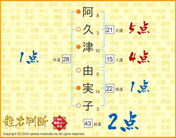 阿(8画)久(3画)津(10画) 由(5画)実(14画)子(3画)