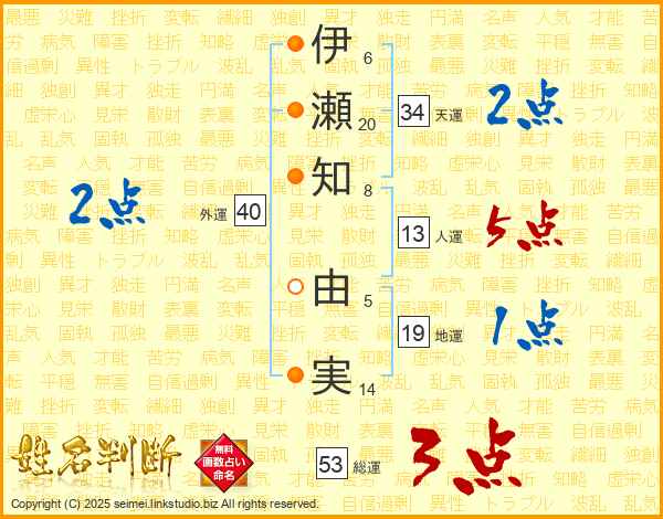 伊(6画)瀬(20画)知(8画) 由(5画)実(14画)