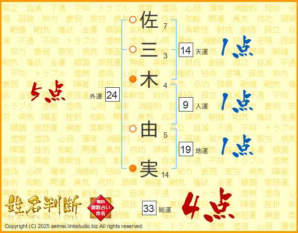 佐(7画)三(3画)木(4画) 由(5画)実(14画)