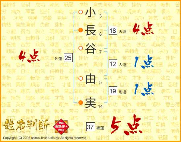小(3画)長(8画)谷(7画) 由(5画)実(14画)