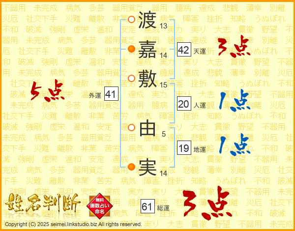 渡(13画)嘉(14画)敷(15画) 由(5画)実(14画)