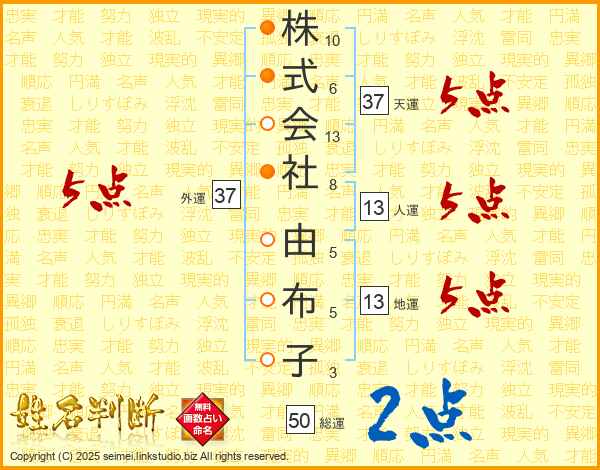 株式会社由布子さんの総運は50画の2点!