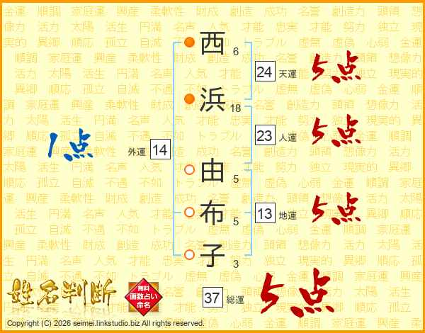 西(6画)浜(18画) 由(5画)布(5画)子(3画)