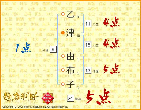 乙津由布子さんの総運は24画の5点!