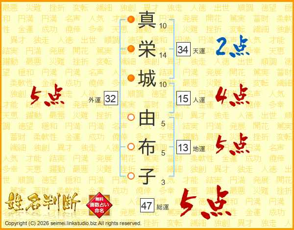 真(10画)栄(14画)城(10画) 由(5画)布(5画)子(3画)