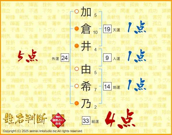 加(5画)倉(10画)井(4画) 由(5画)希(7画)乃(2画)