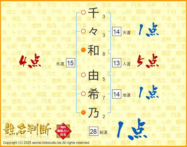 千(3画)々(3画)和(8画) 由(5画)希(7画)乃(2画)