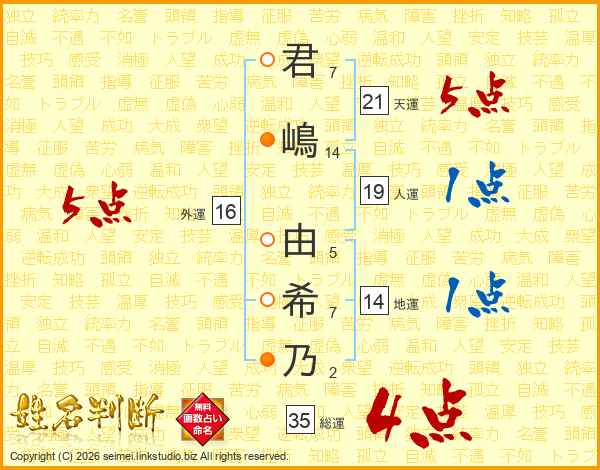 君(7画)嶋(14画) 由(5画)希(7画)乃(2画)