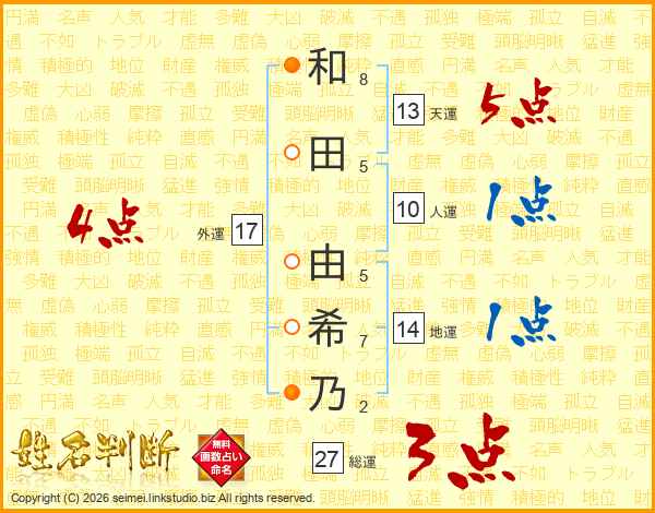 和(8画)田(5画) 由(5画)希(7画)乃(2画)