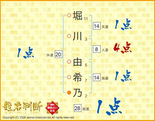 堀(11画)川(3画) 由(5画)希(7画)乃(2画)