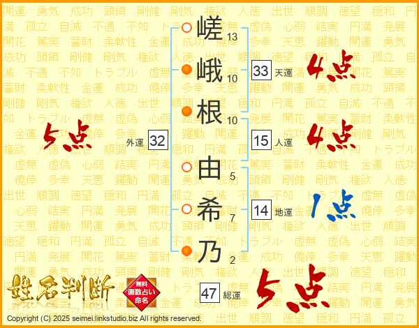嵯峨根由希乃さんの総運は47画の5点!