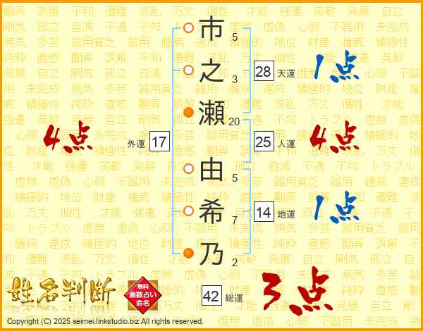 市(5画)之(3画)瀬(20画) 由(5画)希(7画)乃(2画)