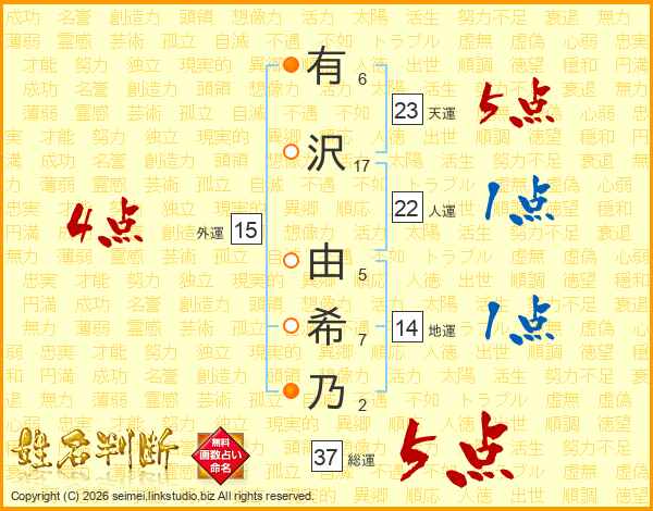 有(6画)沢(17画) 由(5画)希(7画)乃(2画)