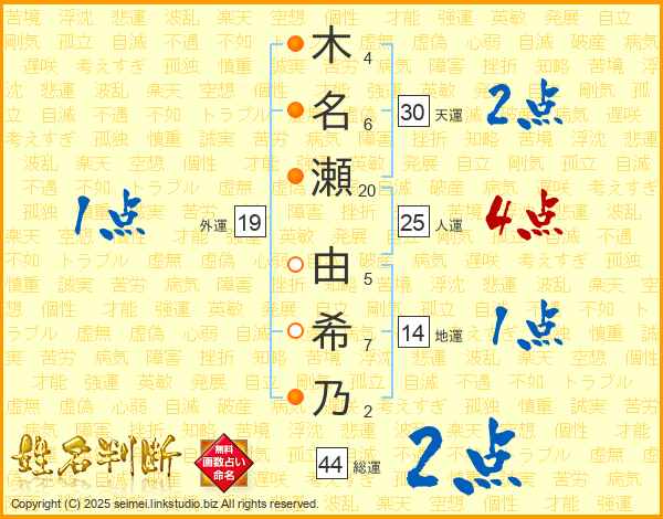 木(4画)名(6画)瀬(20画) 由(5画)希(7画)乃(2画)