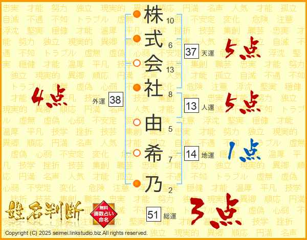 株(10画)式(6画)会(13画)社(8画) 由(5画)希(7画)乃(2画)