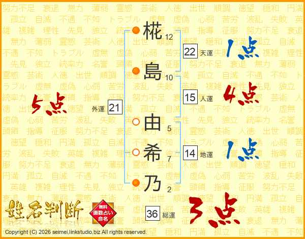 椛(12画)島(10画) 由(5画)希(7画)乃(2画)
