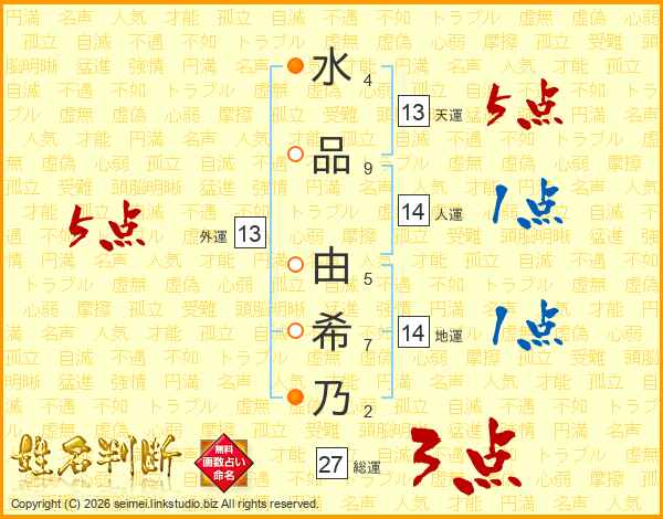 水(4画)品(9画) 由(5画)希(7画)乃(2画)