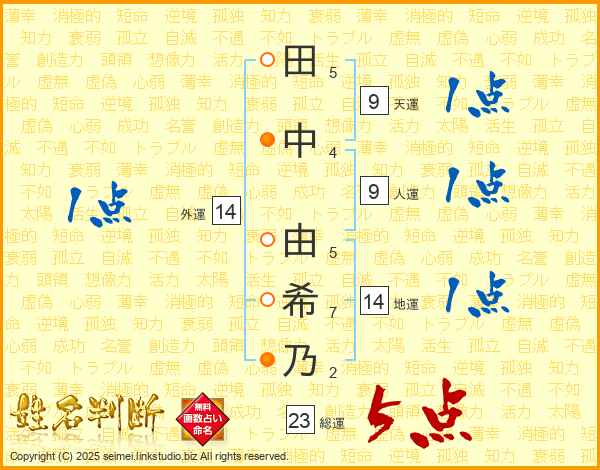 田(5画)中(4画) 由(5画)希(7画)乃(2画)