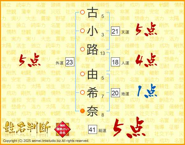 古(5画)小(3画)路(13画) 由(5画)希(7画)奈(8画)