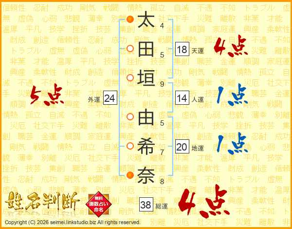 太(4画)田(5画)垣(9画) 由(5画)希(7画)奈(8画)