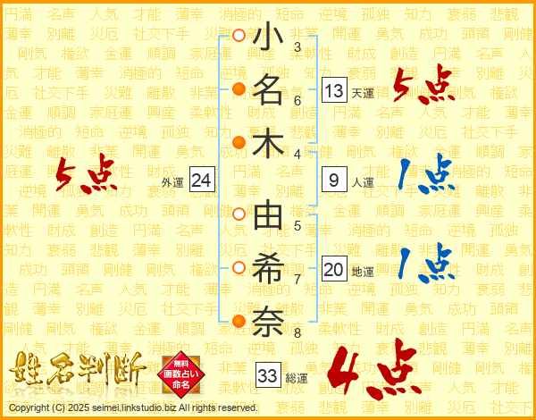 小(3画)名(6画)木(4画) 由(5画)希(7画)奈(8画)
