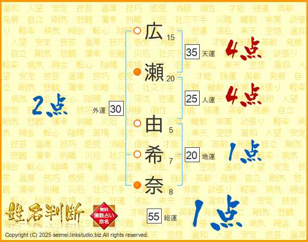 広瀬由希奈さんの人運は25画の4点!