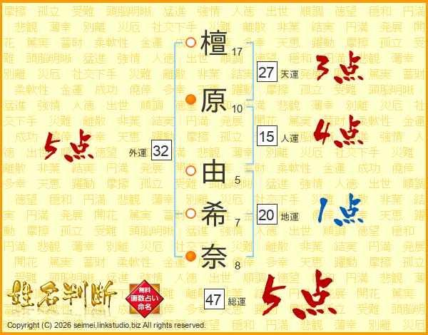 檀原由希奈さんの総運は47画の5点!