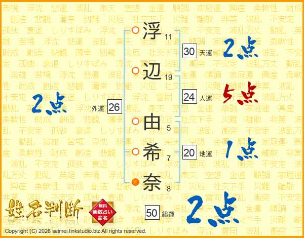 浮(11画)辺(19画) 由(5画)希(7画)奈(8画)