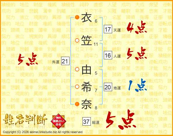 衣(6画)笠(11画) 由(5画)希(7画)奈(8画)