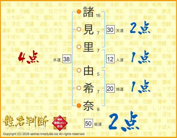 諸(16画)見(7画)里(7画) 由(5画)希(7画)奈(8画)