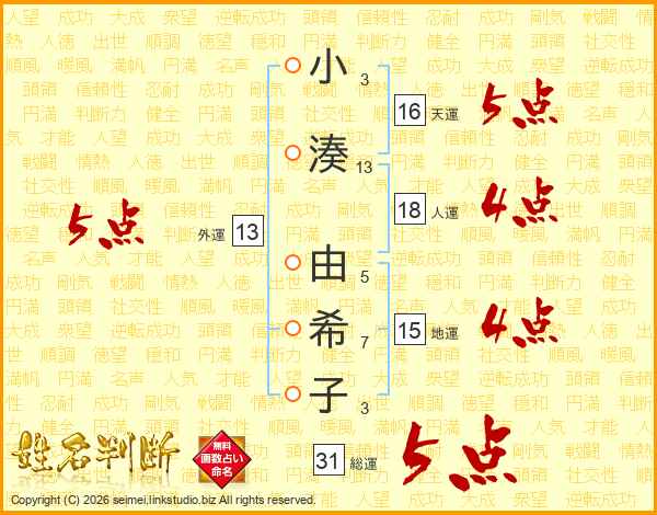 小(3画)湊(13画) 由(5画)希(7画)子(3画)