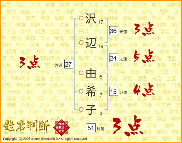 沢(17画)辺(19画) 由(5画)希(7画)子(3画)