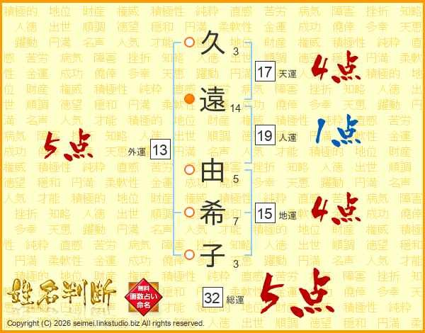 久(3画)遠(14画) 由(5画)希(7画)子(3画)