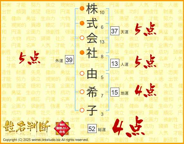 株(10画)式(6画)会(13画)社(8画) 由(5画)希(7画)子(3画)