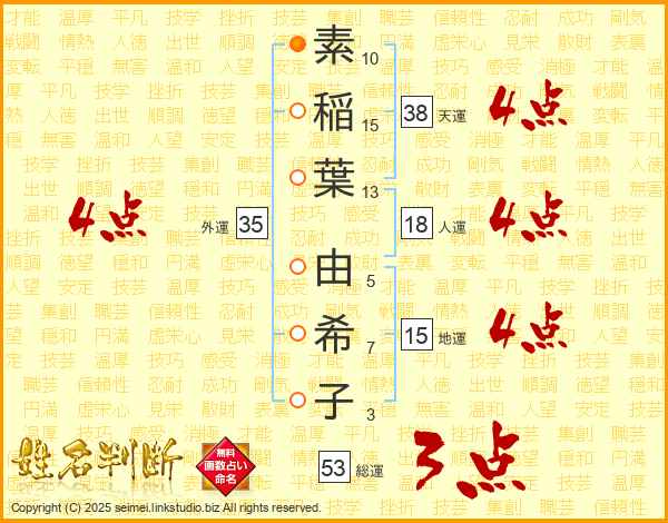 素(10画)稲(15画)葉(13画) 由(5画)希(7画)子(3画)