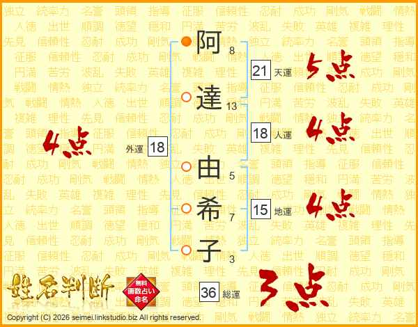 阿(8画)達(13画) 由(5画)希(7画)子(3画)